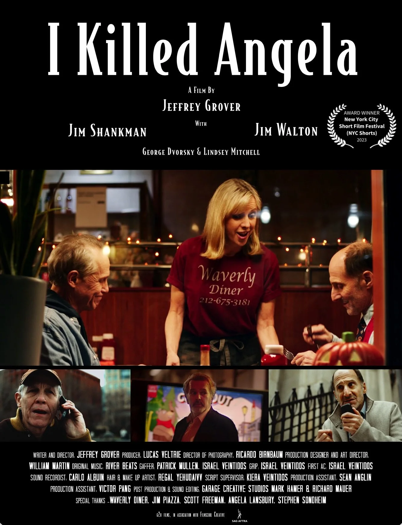 “I Killed Angela” short film written and directed by Jeffrey Grover received its premiere at the NYC Short Film Festival at Symphony Space (October 2023) Starring Jim Walton and Jim Shankman. Wins “Audience Choice Award”
